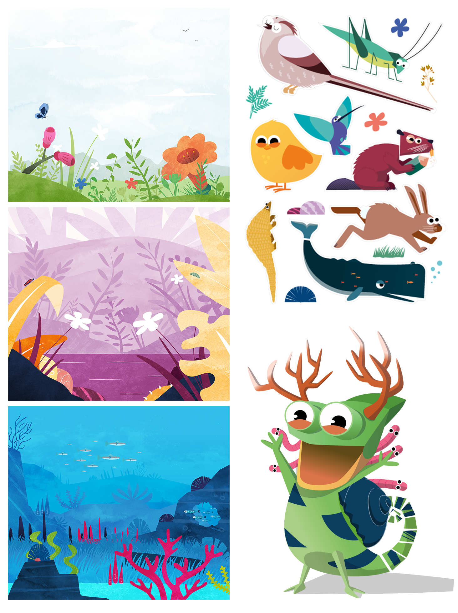 l’ensemble des visuels de l’exposition : affiche, une vingtaine d’illustrations d’animaux, décors de vitrines, éléments pour jeu de piste, stickers…
